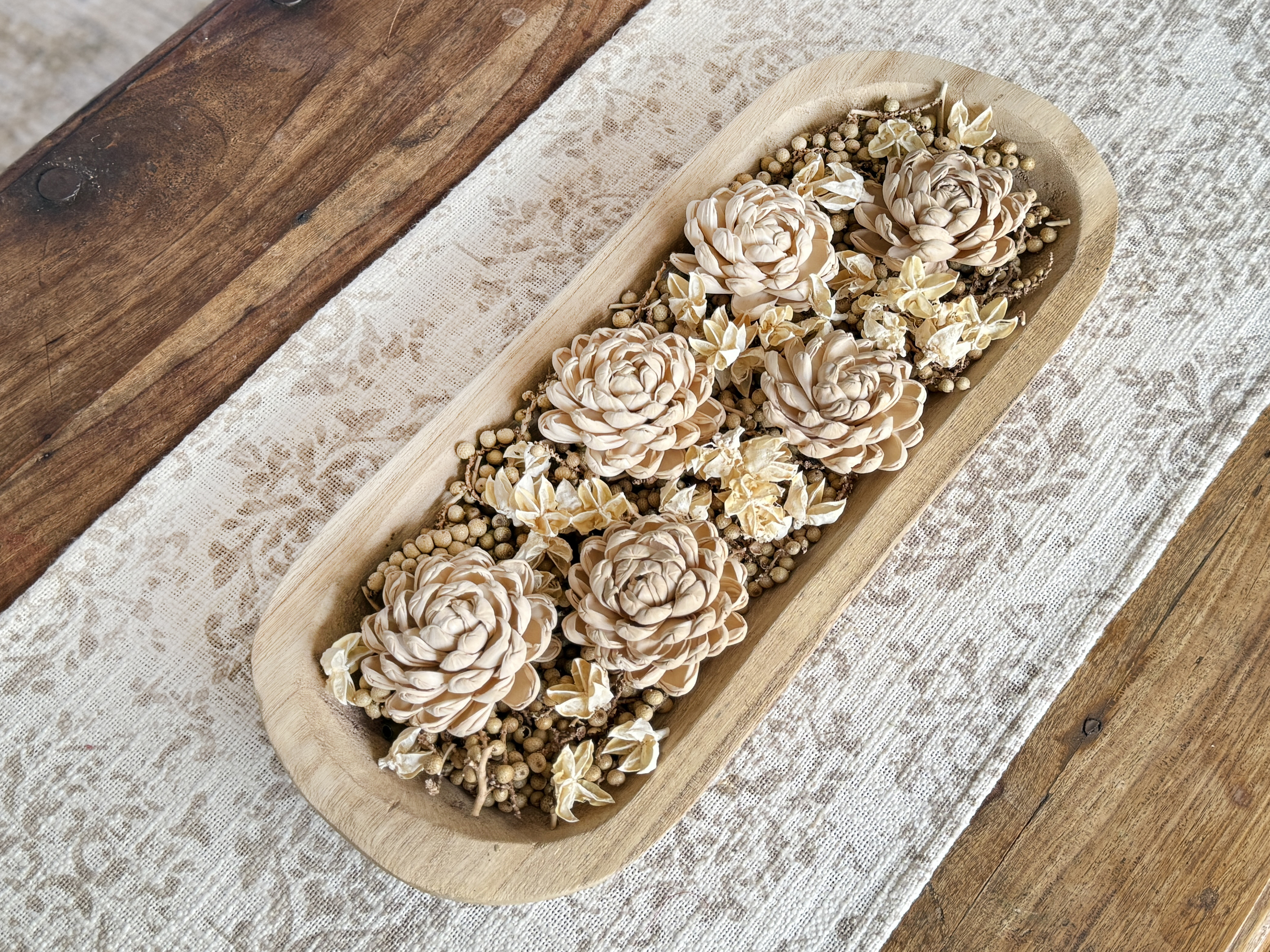 Shown styled in a wooden dough bowl with pinecones, seed pods, and earthy botanicals, these blossoms blend effortlessly into collected, neutral décor. Their creamy beige tone pairs beautifully with wood, burlap, antique books, and rustic textures—making them ideal for farmhouse, cottage, and modern organic interiors.