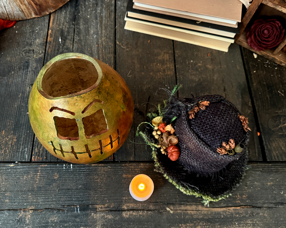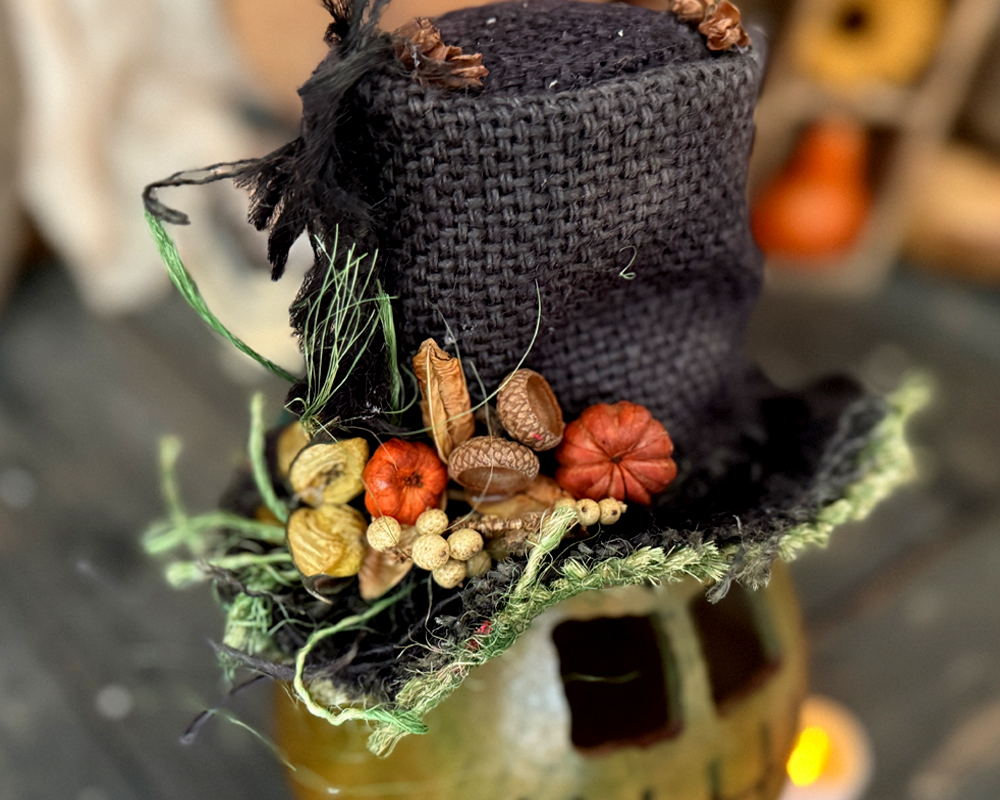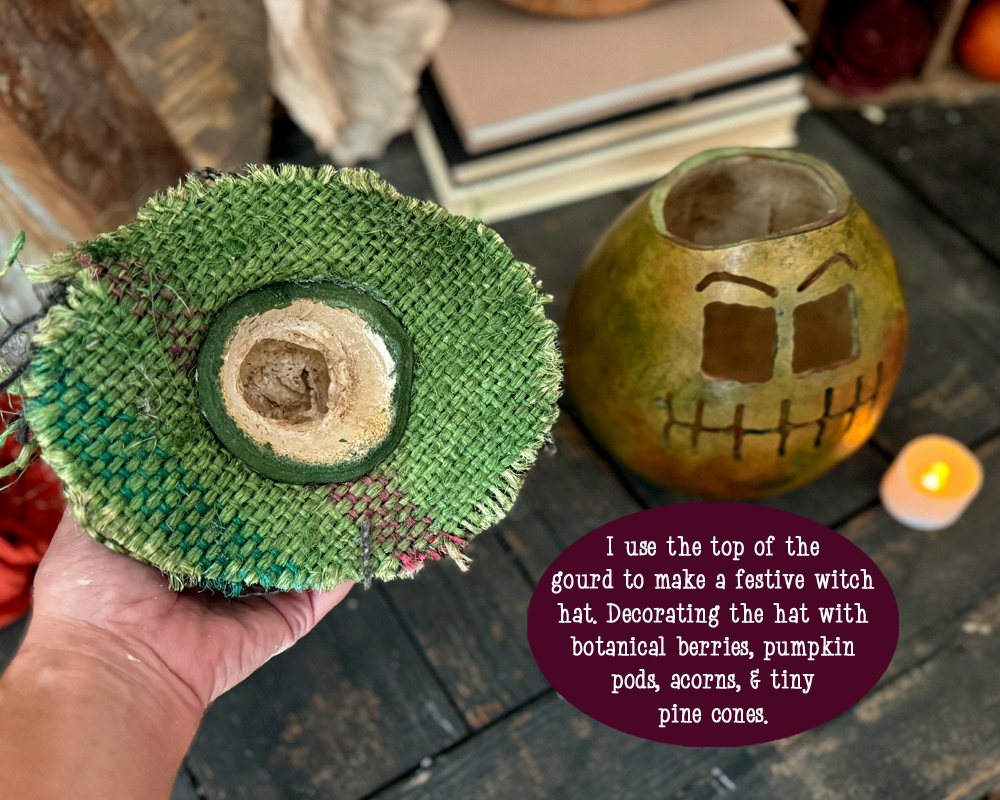 Custom Fall-Themed Hats: Using the gourd tops, I craft custom fall-themed hats for each character. I incorporate upcycled fabrics, ropes, and dried botanical elements to create hats that reflect the essence of autumn.