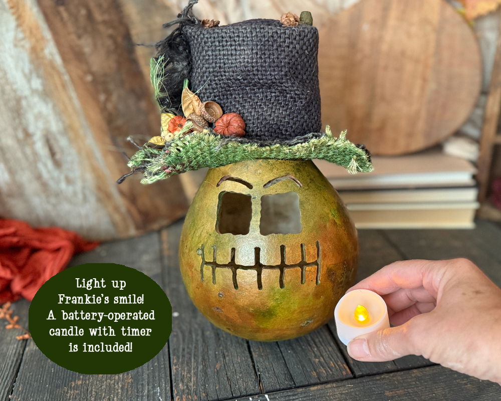 Frankie the Halloween Gourd is a unique pumpkin decoration to collect for your Halloween decorating!