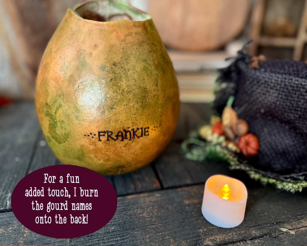 Through this creative process, Frankie and his fellow pumpkin gourd friends come to life, ready to bring joy and whimsy to your autumn decor. Each step, from seedling to finished product, is infused with care and craftsmanship, ensuring that every gourd is a true work of art and a celebration of the fall season's bounty.