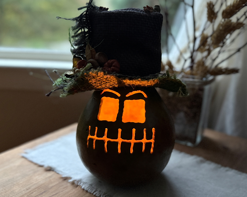 Artistic Carving: Just like carving a fresh jack-o-lantern, Frankie's Halloween face is intricately hand-carved to bring out his whimsical expression and personality. I use translucent paints and a wax finish to highlight the natural beauty of the gourd shell, giving it a smooth and polished texture.