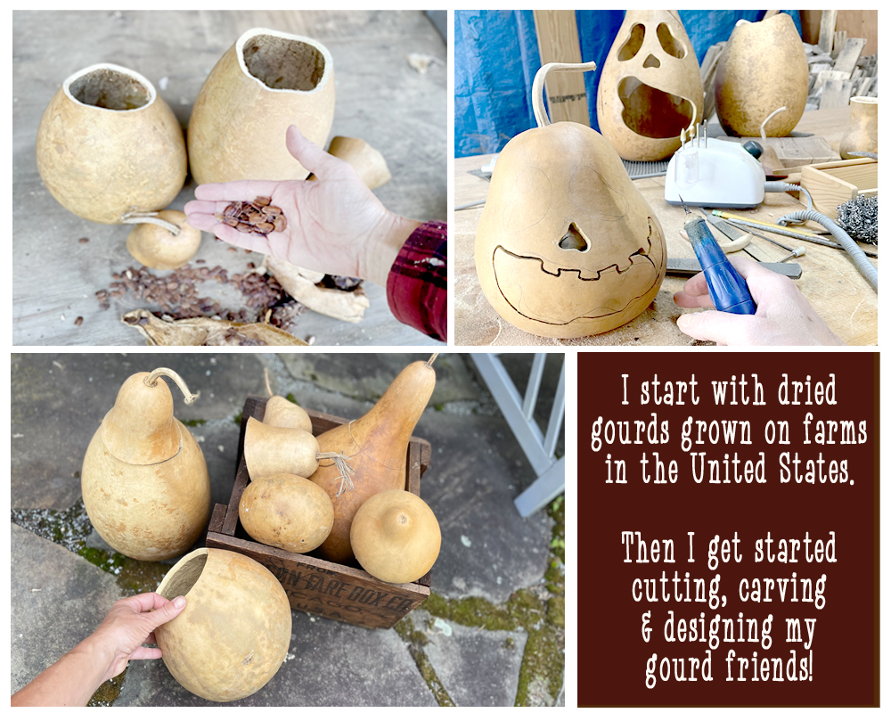 I use the gourds to create whimsical fall pumpkin characters with a ton of personality. I also enjoy turning the gourds into decorative bowls, vases, and vessels. Each gourd shape is unique, so each gourd piece is a one-of-a-kind!