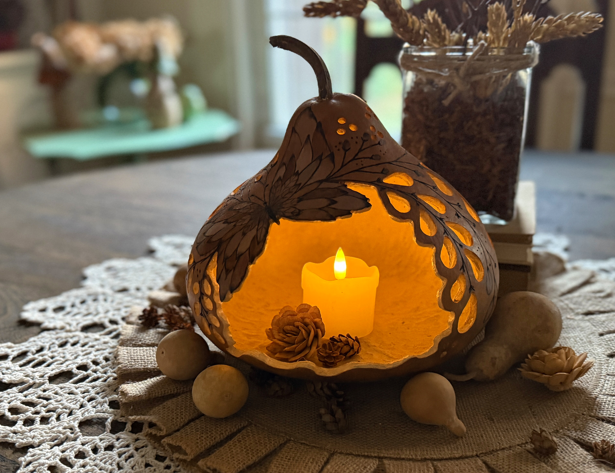 Brighten your home with this handcrafted butterfly gourd luminary, a warm and inviting piece of natural home décor made from a real, farm-grown gourd. This unique luminary features hand-carved lacey leaf cutouts and detailed butterfly artwork, allowing the included battery-operated candle to cast a soft, glowing light through the carved openings.