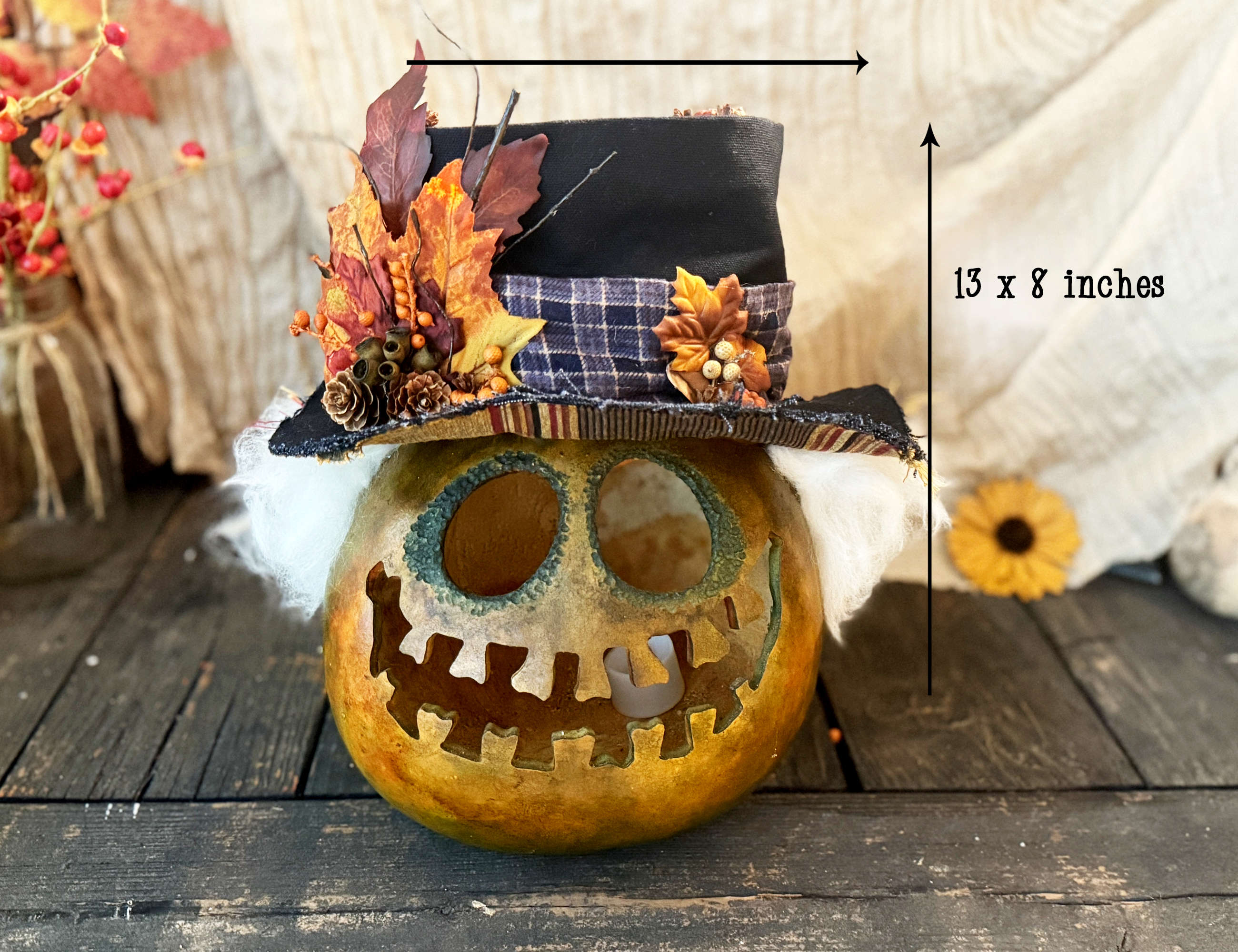 Bring home Igor the Whimsical Fall Pumpkin Gourd to add a touch of autumn magic to your home decor. Whether displayed on a mantel, in your entryway, or as a table centerpiece, he promises to enchant your home with his unique handmade charm. Embrace the spirit of the season with this delightful creation, perfect for Halloween celebrations and beyond.