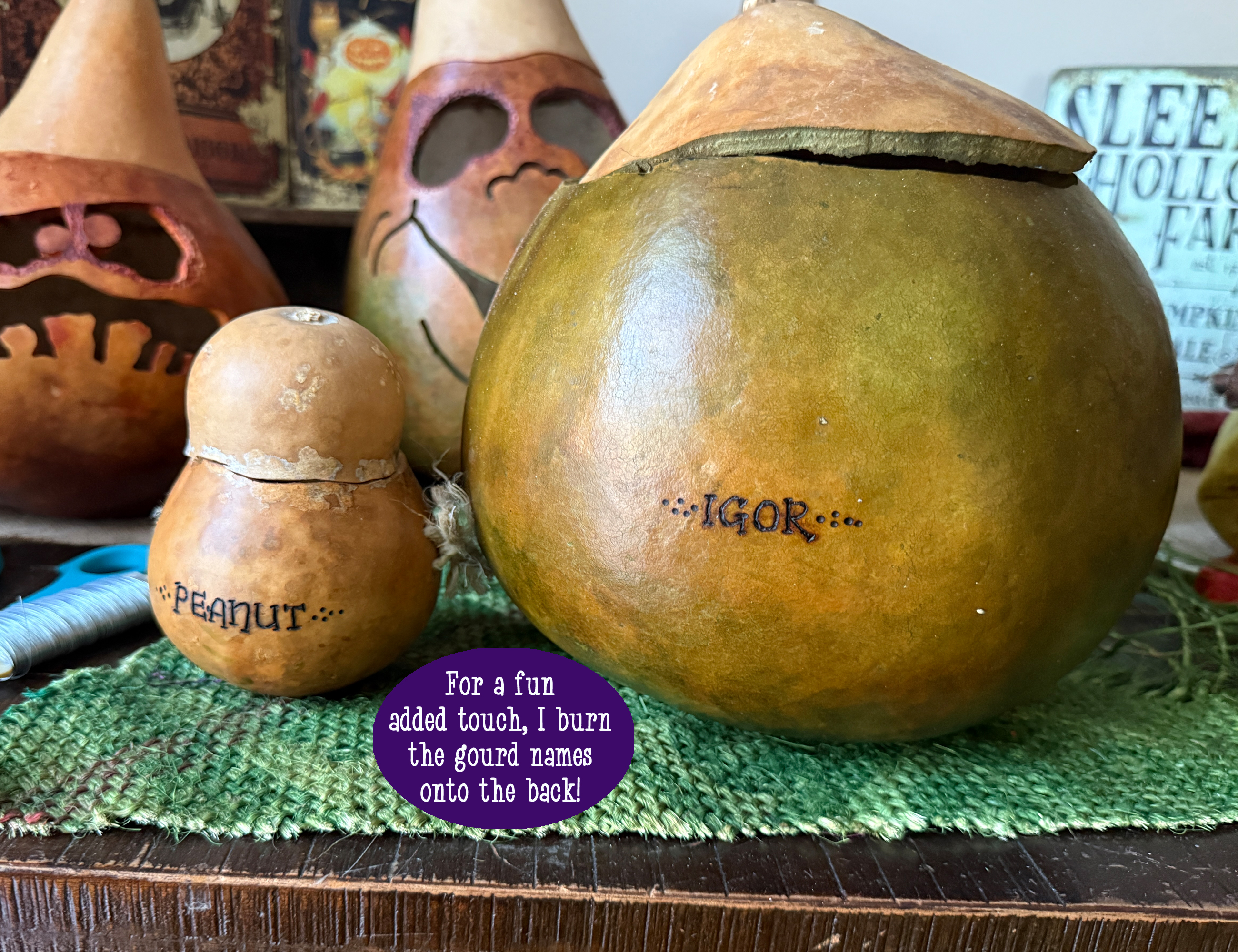 Personalization: Each gourd is special, so I engrave their unique name onto the back of the gourd shell. This personal touch adds a playful element and makes them delightful to collect and display.