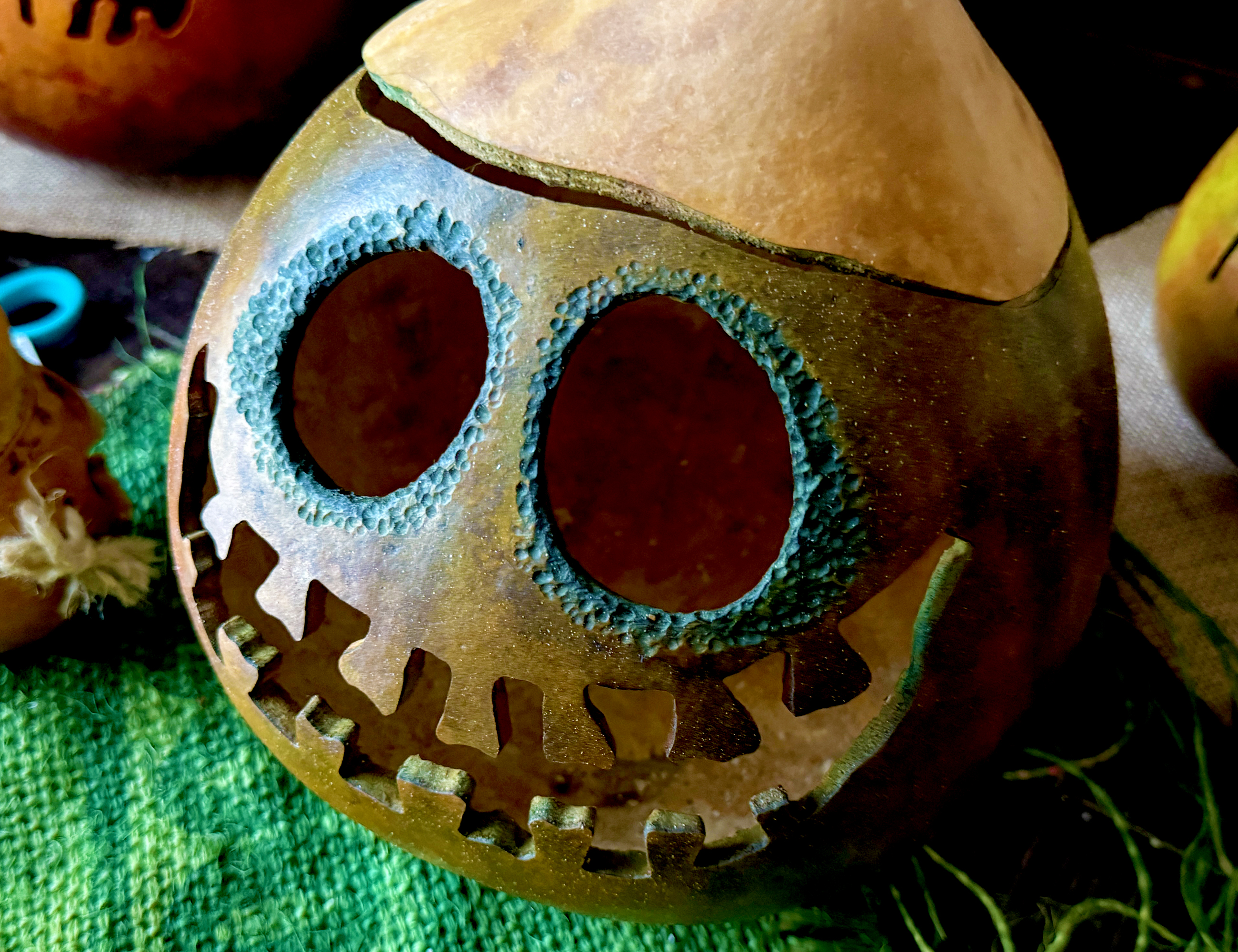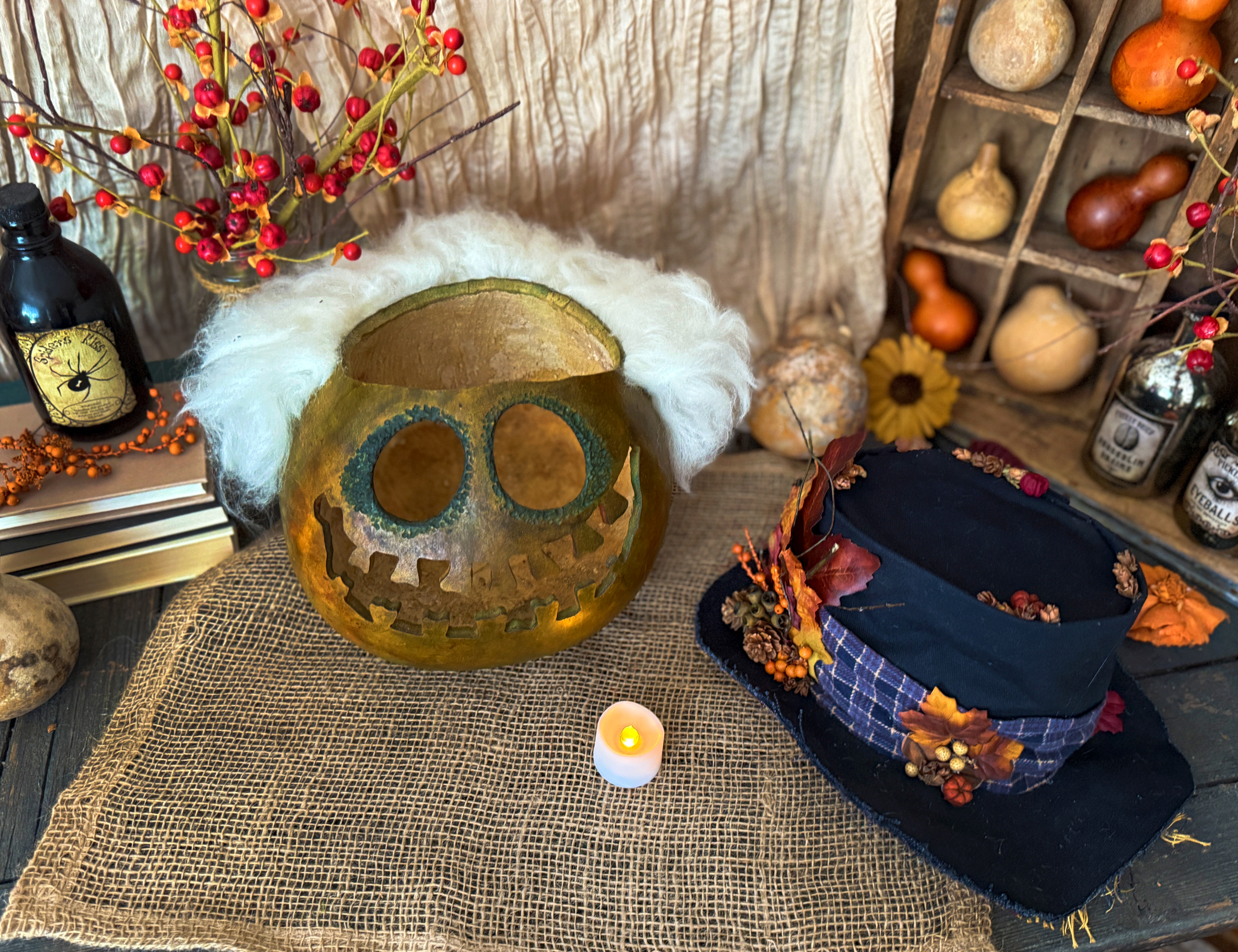 Artistic Carving: Just like carving a fresh jack-o-lantern, Igor's Halloween face is intricately hand-carved to bring out his whimsical expression and personality. I use translucent paints and a wax finish to highlight the natural beauty of the gourd shell, giving it a smooth and polished texture.