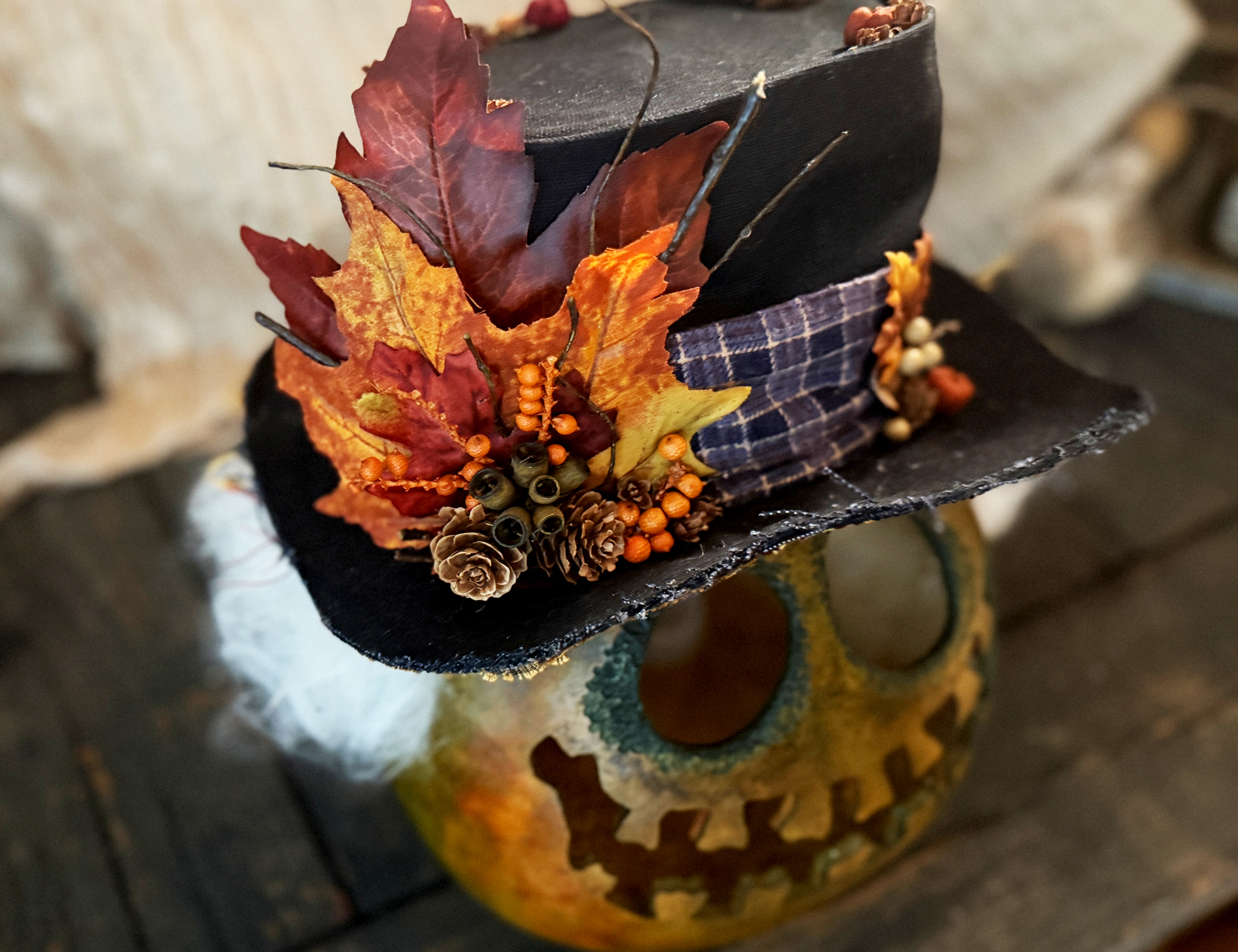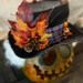 Halloween Top Hat: Adding to his charm, Igor is wearing a beautifully crafted autumn top hat inspired by the Mad Hatter's whimsy. The hat features textures and foliage that capture the essence of fall. Built-in wires allow for adjusting the brim and point of the hat, giving each pumpkin a unique look.