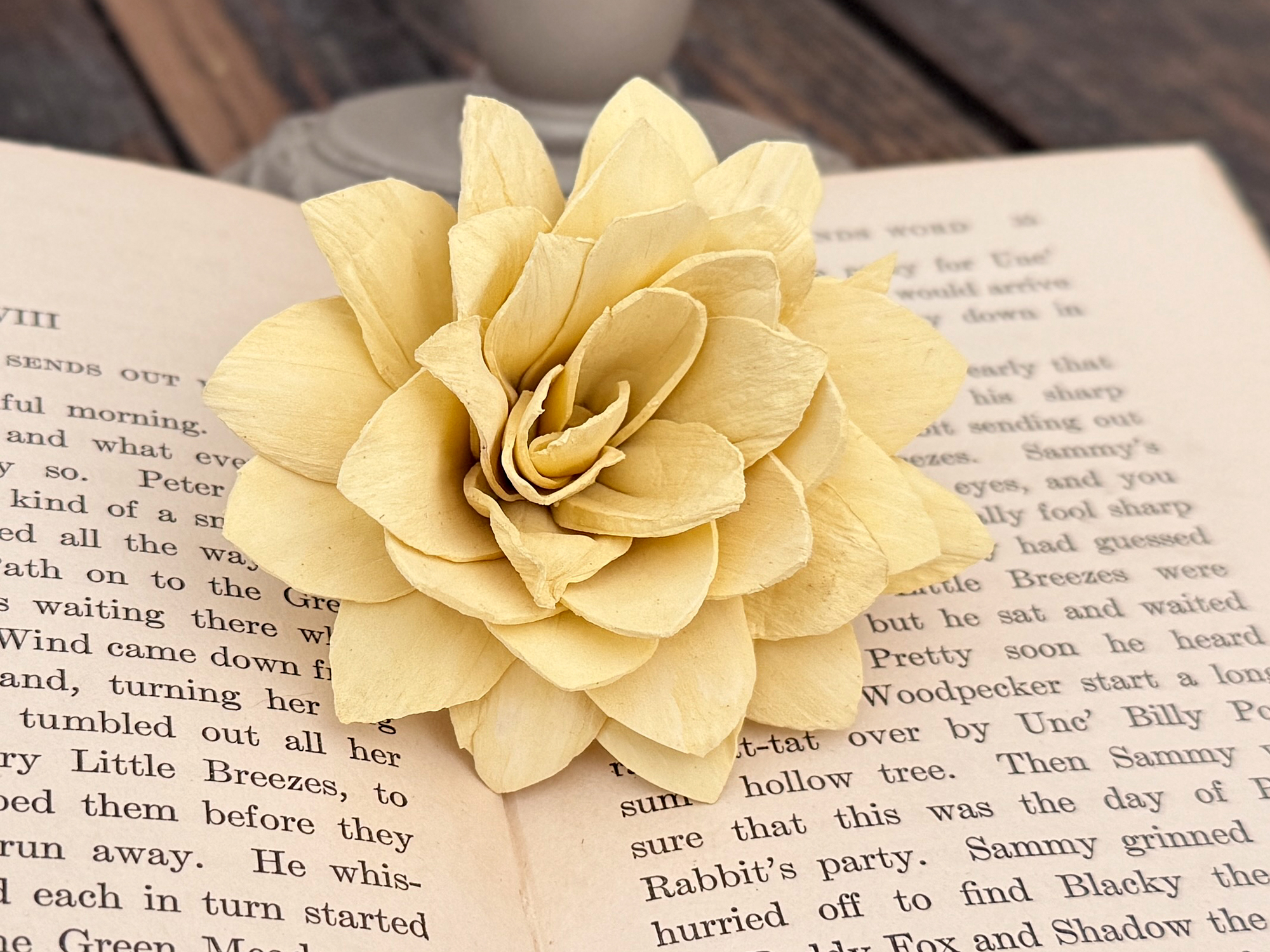 Inspired by sun-warmed gardens and slow summer evenings, this hand-painted wood flower is finished in my custom dusty soft yellow—muted, creamy, and gently romantic. The color feels like faded sunshine, softened by time, creating a tone that is warm without being bright.