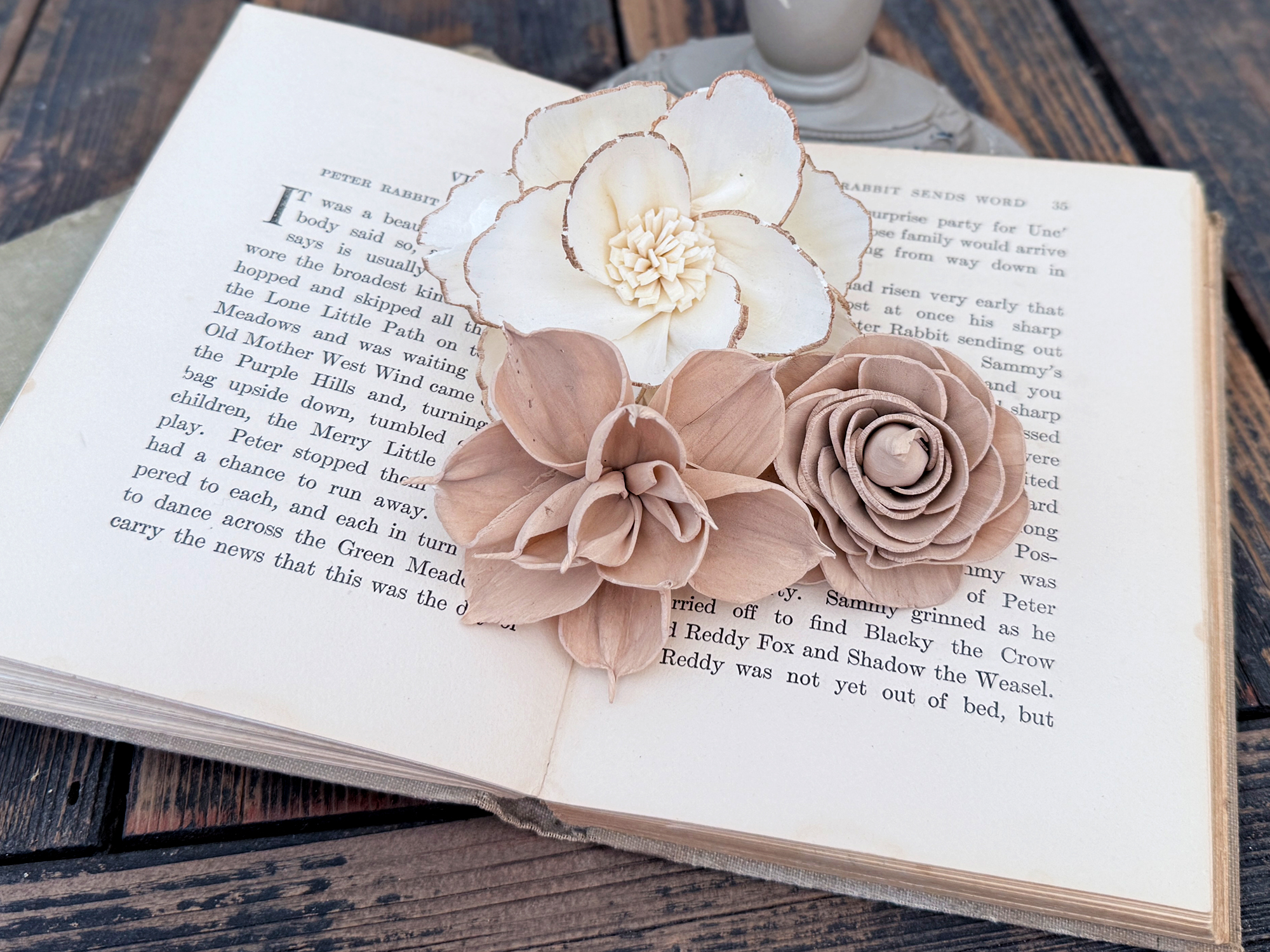 Soft, layered, and full of garden romance, this hand-painted sola wood flower is finished in a custom-mixed taupe with the faintest touch of blush pink. The result is a muted, vintage-inspired tone that feels both earthy and feminine.