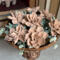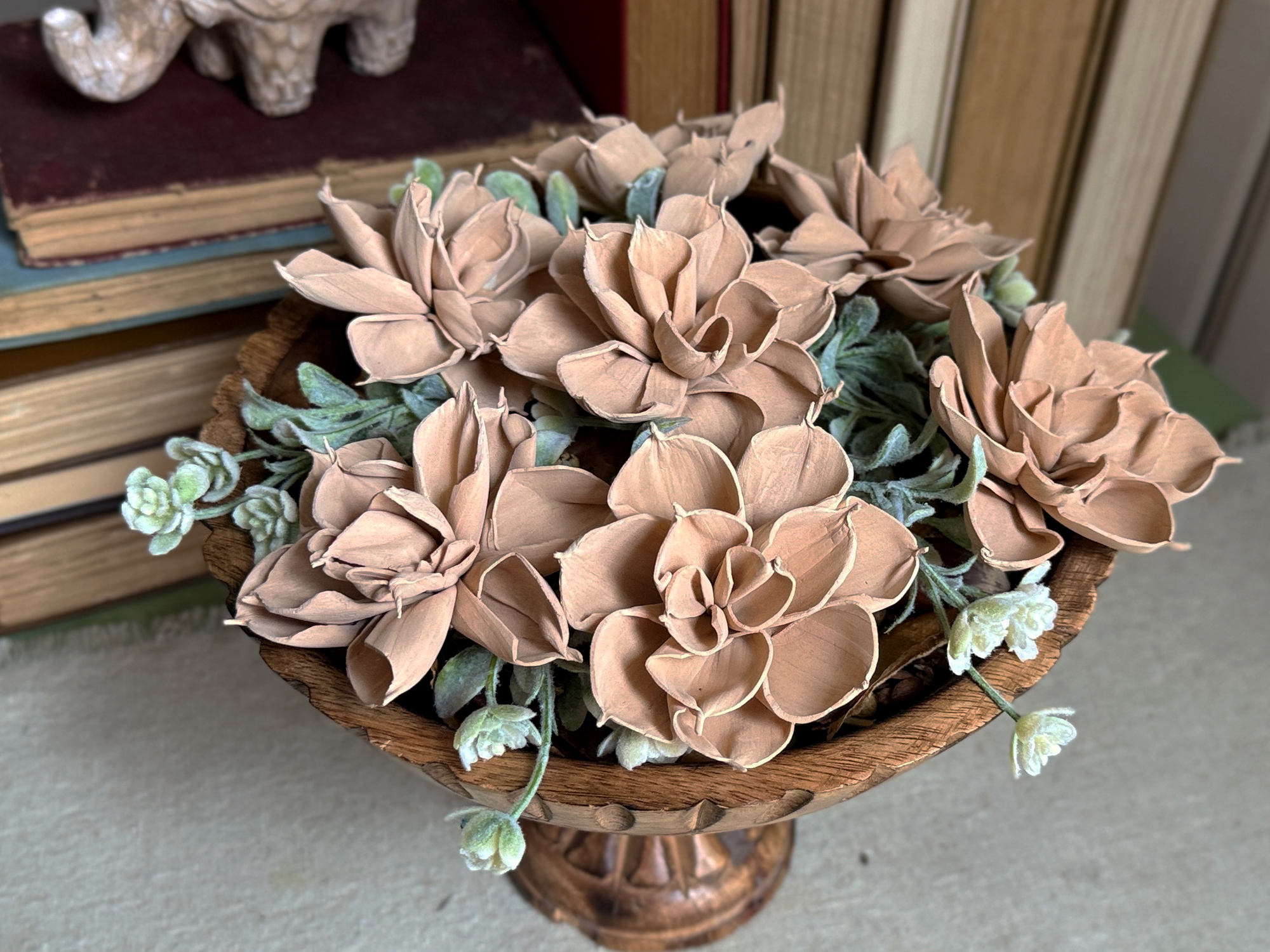 Each bloom features delicately shaped, dimensional petals that curl naturally at the edges, creating depth and movement. Styled on warm wooden risers, nestled into rustic dough bowls, and paired with berries and natural botanicals, these flowers bring a collected, heirloom feel to your space.